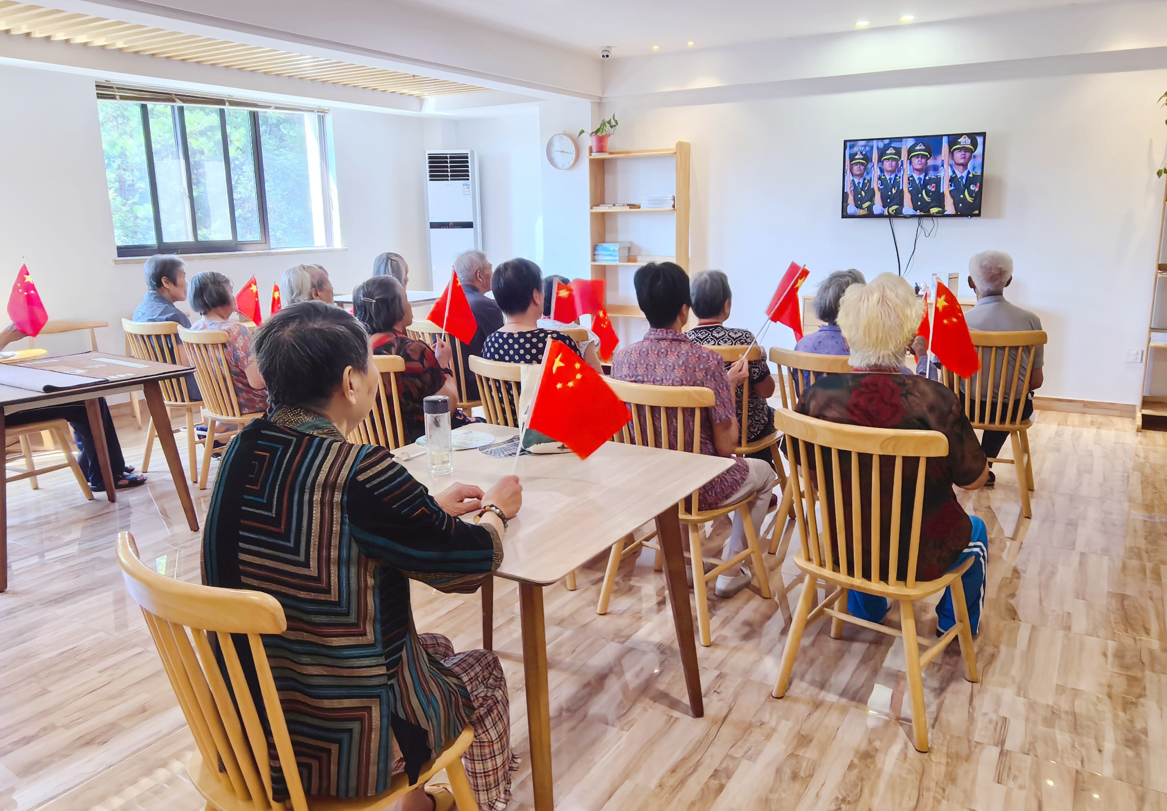 当国歌奏响,五星红旗缓缓升起的瞬间,所有长者都专注地凝视着屏幕,仿佛置身现场,感受着那份肃穆与庄严。他们随着音乐齐声唱起国歌,流露出的是对祖国浓浓的热爱与崇高的敬意。