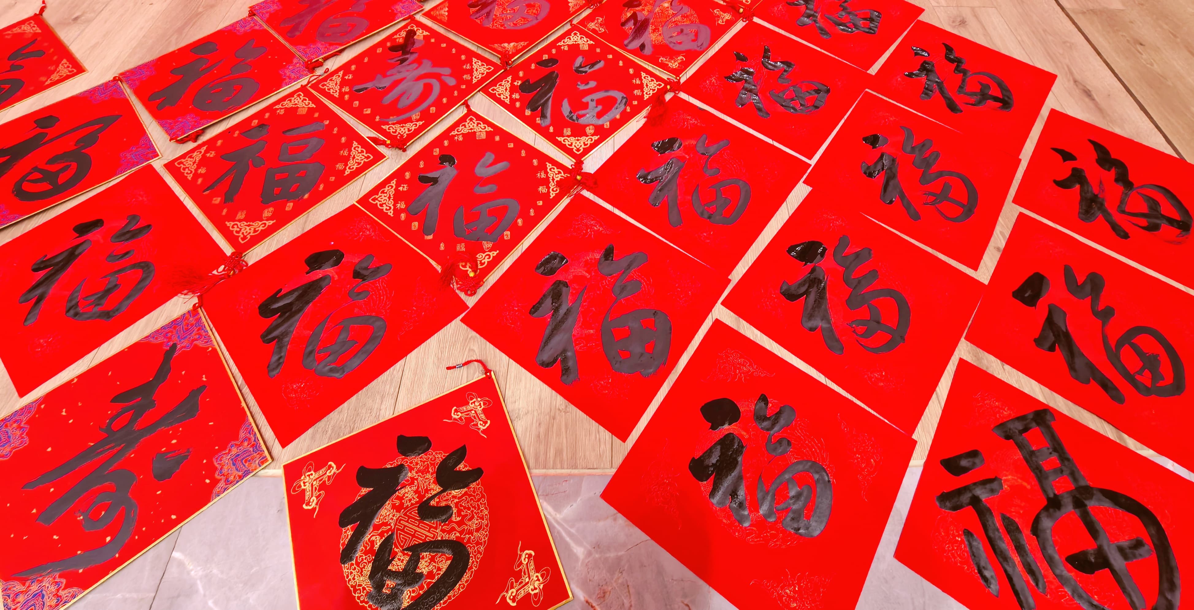 活动现场喜气洋洋,大红宣纸整齐铺展,笔墨砚台依次陈列,墨香四溢间满是喜庆氛围。文化馆书法老师们凝神挥毫、笔走龙蛇,以2026马年吉祥寓意为核心,将“骏马奔腾春色丽,宏图大展气象新”“春风送暖花千树,瑞雪迎新福满门”等饱含美好期许的春联,以及一个个饱满圆润的“福”与“寿”字跃然纸上,每一笔都藏着真挚祝福,每一副都透着浓浓年味。